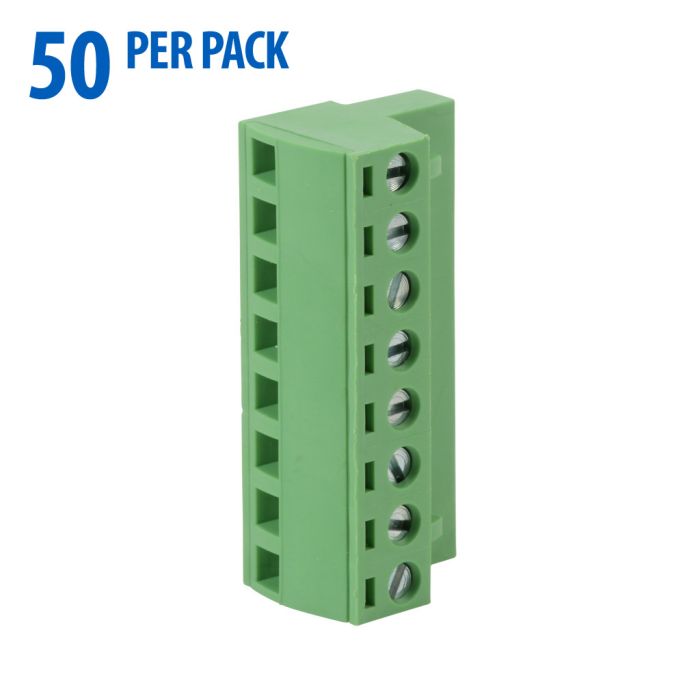 DINnector terminal plug, 8-pole, 22-14 AWG, green, 12A, 300V rated (UL), Top wire entry with terminal screw 90 degrees from entry, 50 pieces per package.