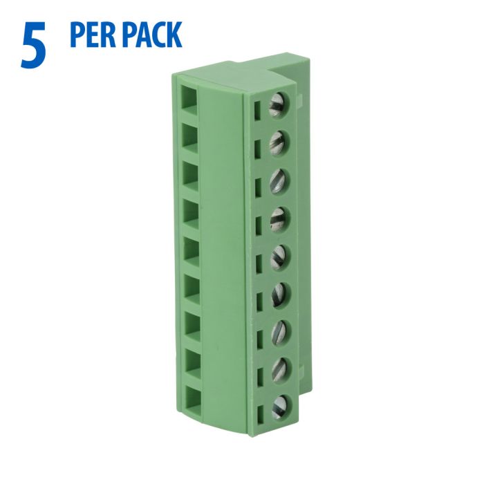 DINnector terminal plug, 9-pole, 22-14 AWG, green, 12A, 300V rated (UL), Top wire entry with terminal screw 90 degrees from entry, 5 pieces per package.