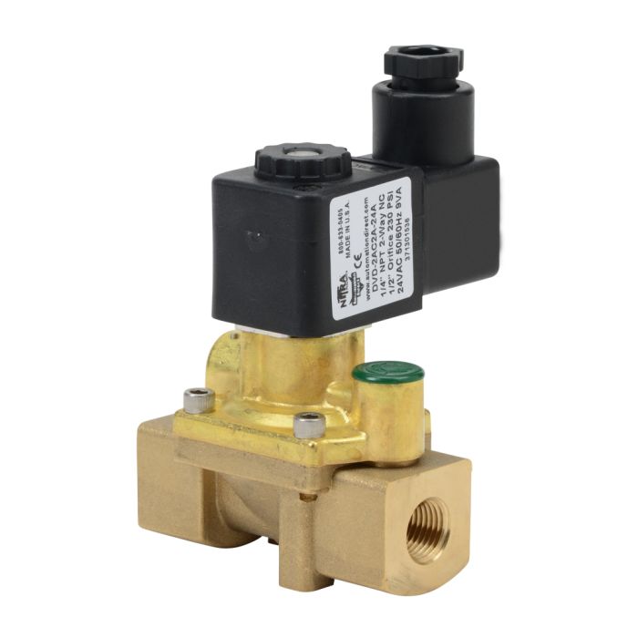 NITRA solenoid valve 2-way 2-position, N.C., single solenoid spring return, 1/4in FNPT inlet(s), 1/4in FNPT outlet(s), Cv=1.55, 24 VAC, 18mm DIN style wiring plug.