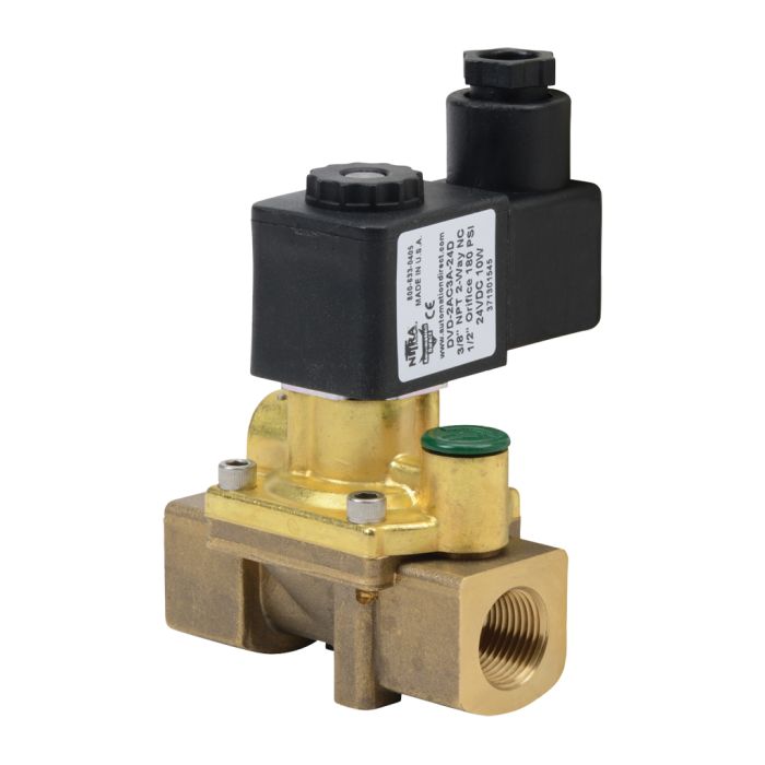 NITRA solenoid valve 2-way 2-position, N.C., single solenoid spring return, 3/8in FNPT inlet(s), 3/8in FNPT outlet(s), Cv=1.95, 24 VDC, 18mm DIN style wiring plug.