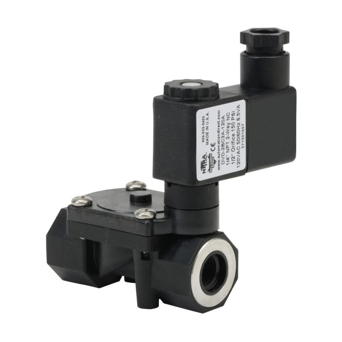 NITRA solenoid valve 2-way 2-position, N.C., single solenoid spring return, 1/4in FNPT inlet(s), 1/4in FNPT outlet(s), Cv=1.55, 120 VAC, 11mm DIN style wiring plug.