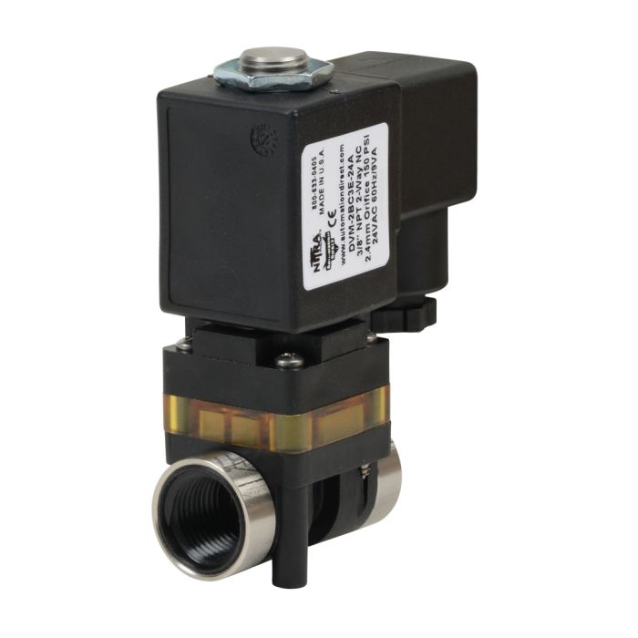 NITRA media separated solenoid valve 2-way 2-position, N.C., single solenoid spring return, 3/8in FNPT inlet(s), 3/8in FNPT outlet(s), Cv=0.24, 24 VAC, 18mm DIN style wiring plug.