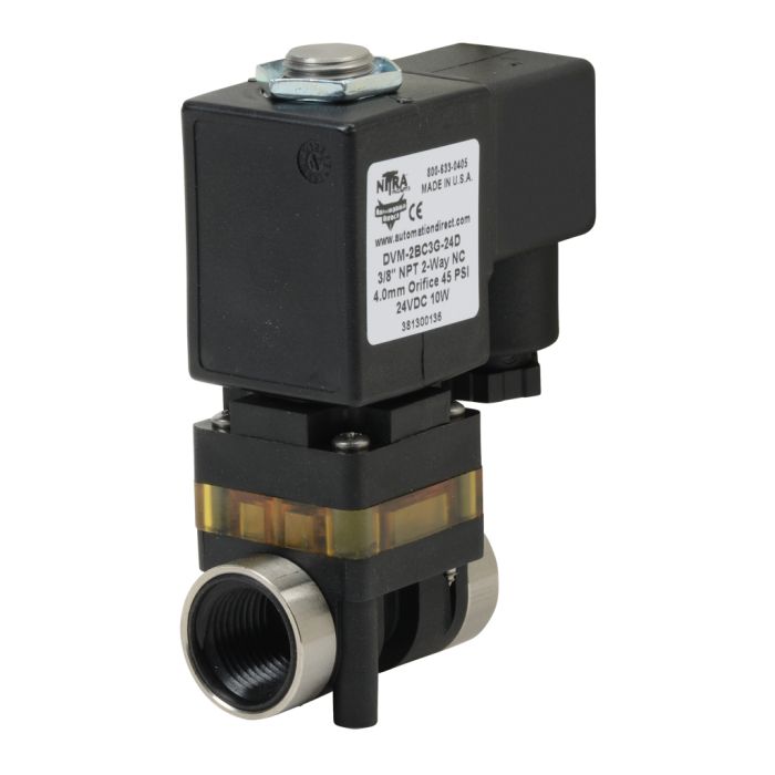 NITRA media separated solenoid valve 2-way 2-position, N.C., single solenoid spring return, 3/8in FNPT inlet(s), 3/8in FNPT outlet(s), Cv=0.52, 24 VDC, 18mm DIN style wiring plug.