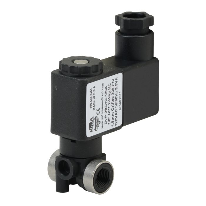 NITRA solenoid valve 2-way 2-position, N.C., single solenoid spring return, 1/8in FNPT inlet(s), 1/8in FNPT outlet(s), Cv=0.08, 120 VAC, 11mm DIN style wiring plug.
