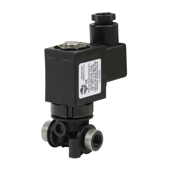 NITRA solenoid valve 2-way 2-position, N.C., single solenoid spring return, 1/8in FNPT inlet(s), 1/8in FNPT outlet(s), Cv=0.12, 120 VAC, 18mm DIN style wiring plug.
