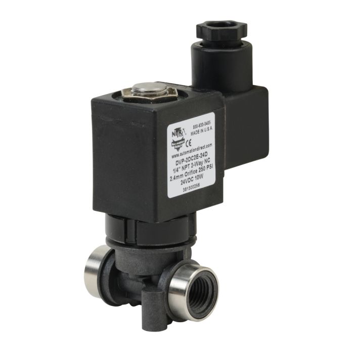 NITRA solenoid valve 2-way 2-position, N.C., single solenoid spring return, 1/4in FNPT inlet(s), 1/4in FNPT outlet(s), Cv=0.245, 24 VDC, 18mm DIN style wiring plug.