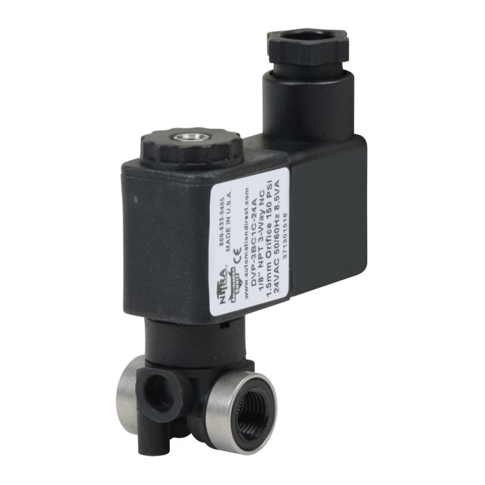 NITRA solenoid valve 3-way 2-position, N.C., single solenoid spring return, 1/8in FNPT inlet(s), 1/8in FNPT outlet(s), Cv=0.08, 24 VAC, 11mm DIN style wiring plug.