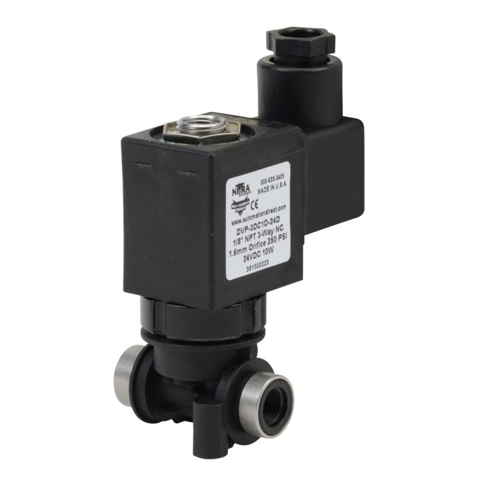 NITRA solenoid valve 3-way 2-position, N.C., single solenoid spring return, 1/8in FNPT inlet(s), 1/8in FNPT outlet(s), Cv=0.12, 24 VDC, 18mm DIN style wiring plug.