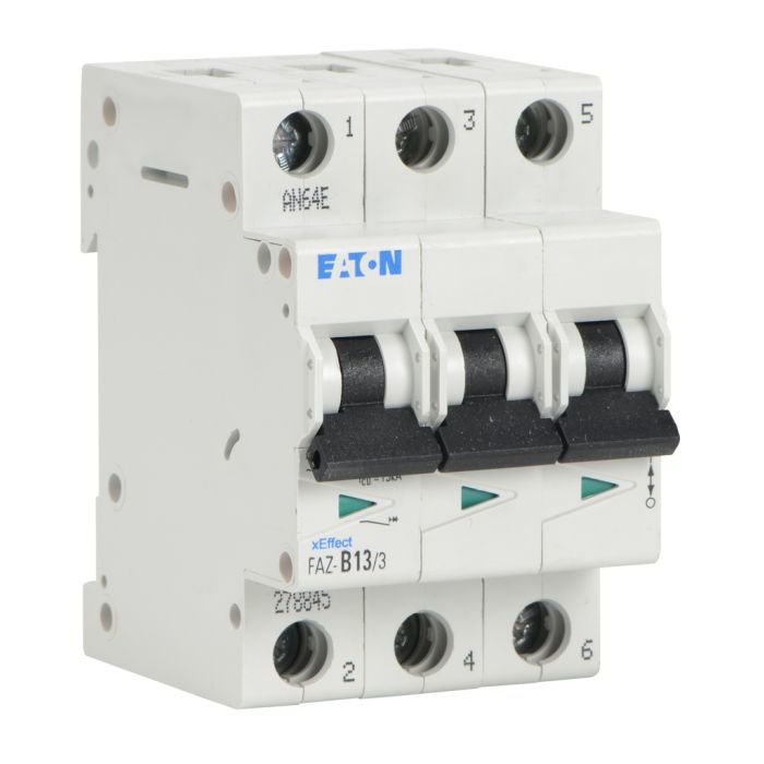 Eaton miniature supplementary protector, 13A, 480Y / 277 VAC / 96 VDC, 3-pole, B curve, thermal magnetic, 10kA SCCR, 35mm DIN rail mount.