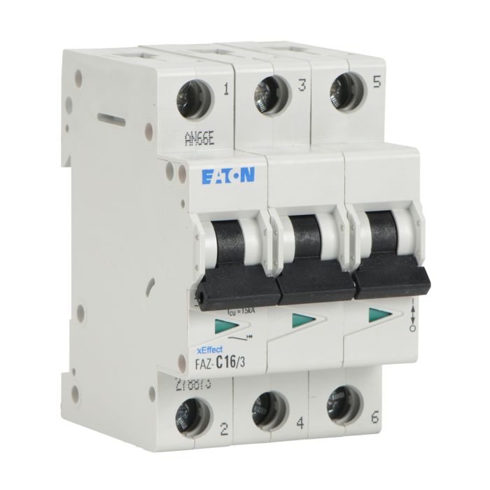 Eaton miniature supplementary protector, 16A, 480Y / 277 VAC / 96 VDC, 3-pole, C curve, thermal magnetic, 10kA SCCR, 35mm DIN rail mount.