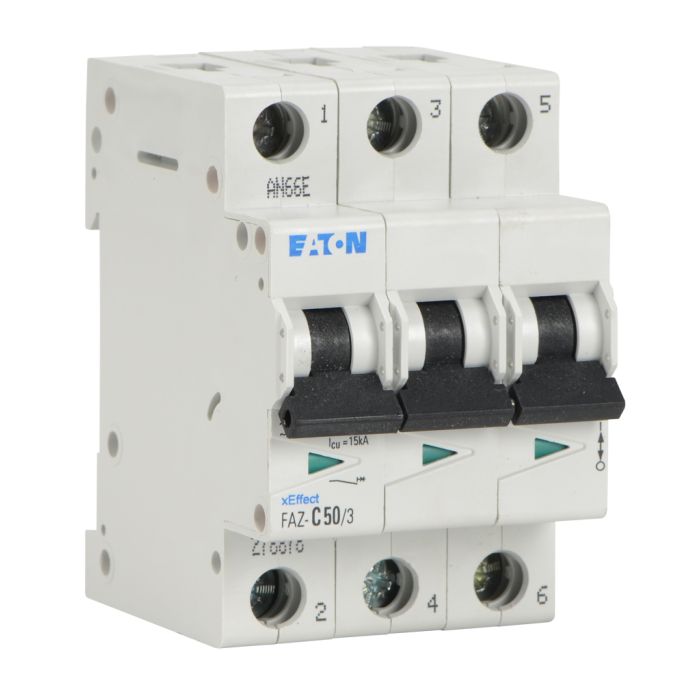 Eaton miniature supplementary protector, 50A, 480Y / 277 VAC / 96 VDC, 3-pole, C curve, thermal magnetic, 5kA SCCR, 35mm DIN rail mount.