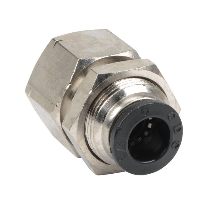 NITRA pneumatic push-to-connect fitting, female, bulkhead, nickel-plated brass body, nickel-plated brass threads, 3/8in tube to 1/4in NPT connection(s). Package of 5.