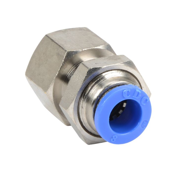 NITRA pneumatic push-to-connect fitting, female, bulkhead, nickel-plated brass body, nickel-plated brass threads, 5/16in (8mm) tube to R1/4 BSPT connection(s). Package of 5.