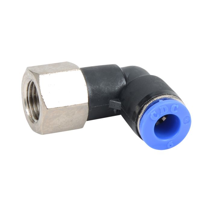NITRA pneumatic push-to-connect fitting, female, elbow, rotating, thermoplastic (PBT) body, nickel-plated brass threads, 6mm tube to R1/8 BSPT connection(s). Package of 5.