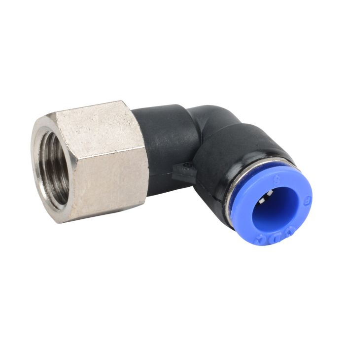 NITRA pneumatic push-to-connect fitting, female, elbow, rotating, thermoplastic (PBT) body, nickel-plated brass threads, 5/16in (8mm) tube to R1/4 BSPT connection(s). Package of 5.