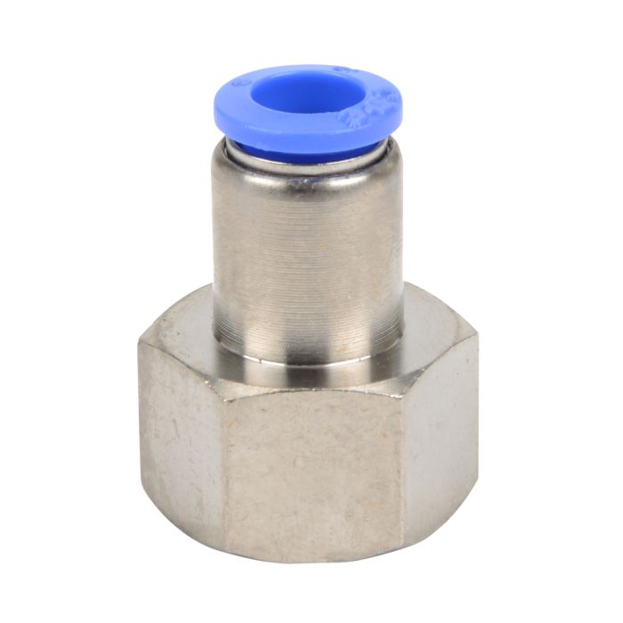 NITRA pneumatic push-to-connect fitting, female, straight, nickel-plated brass body, nickel-plated brass threads, 5/16in (8mm) tube to R3/8 BSPT connection(s). Package of 5.