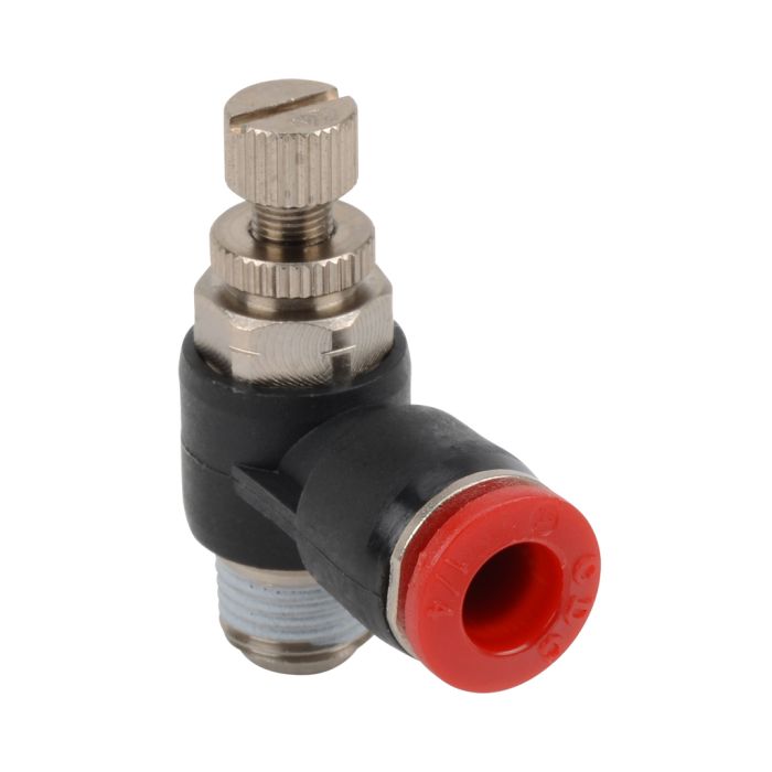 NITRA pneumatic push-to-connect fitting, elbow flow control valve, rotating, meter-in, thermoplastic (PBT) body, nickel-plated brass threads, 1/4in tube to 1/8in NPT connection(s). Package of 2.