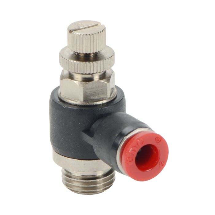 NITRA pneumatic push-to-connect fitting, elbow flow control valve, rotating, meter-in, thermoplastic (PBT) body, nickel-plated brass threads, 6mm tube to G1/4 BSPP connection(s). Package of 2.
