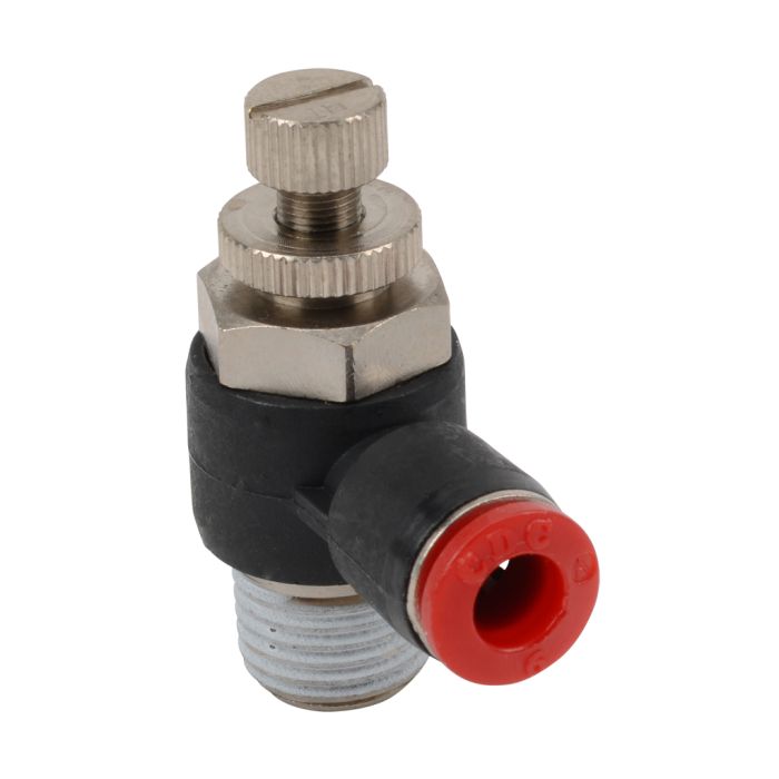 NITRA pneumatic push-to-connect fitting, elbow flow control valve, rotating, meter-in, thermoplastic (PBT) body, nickel-plated brass threads, 6mm tube to R1/4 BSPT connection(s). Package of 2.