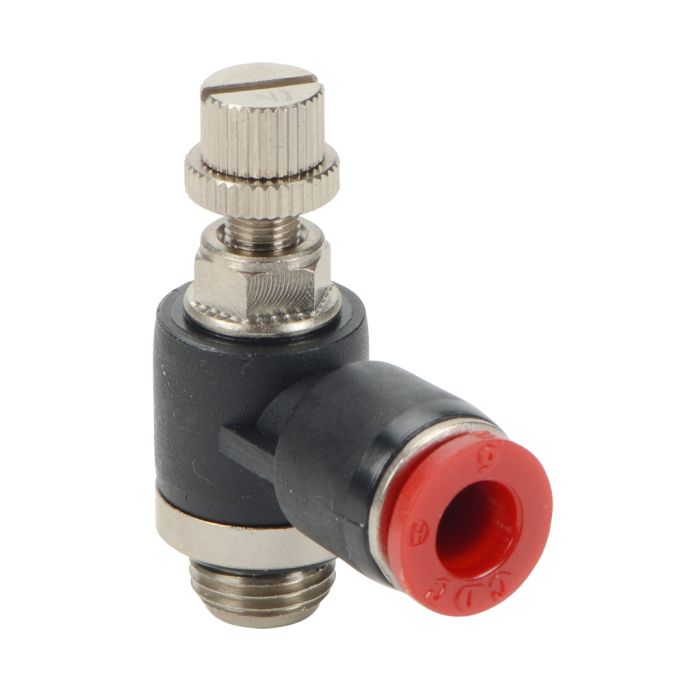 NITRA pneumatic push-to-connect fitting, elbow flow control valve, rotating, meter-in, thermoplastic (PBT) body, nickel-plated brass threads, 6mm tube to G1/8 BSPP connection(s). Package of 2.