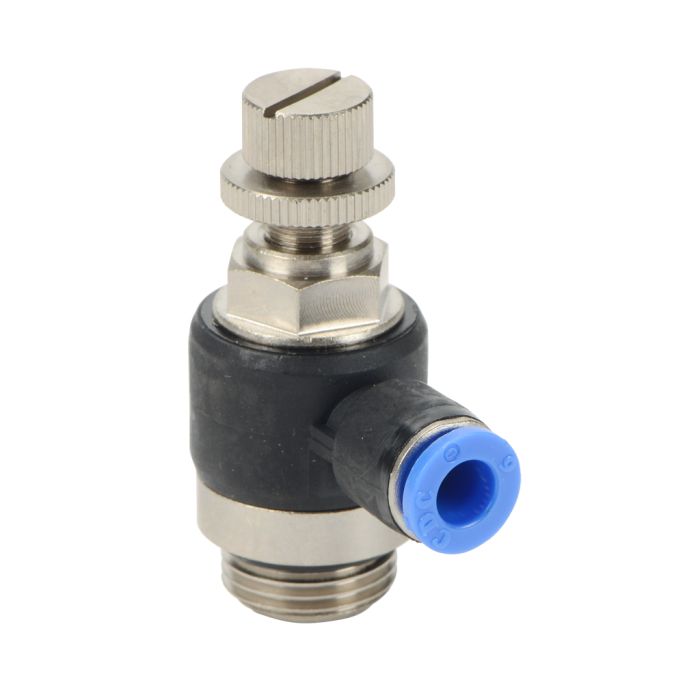 NITRA pneumatic push-to-connect fitting, elbow flow control valve, rotating, meter-out, thermoplastic (PBT) body, nickel-plated brass threads, 6mm tube to G3/8 BSPP connection(s). Package of 2.