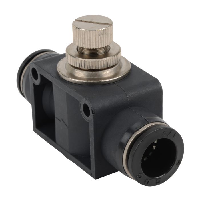 NITRA pneumatic push-to-connect fitting, inline flow control valve, thermoplastic (PBT) body, (2) 1/2in tube connection(s). Package of 2.