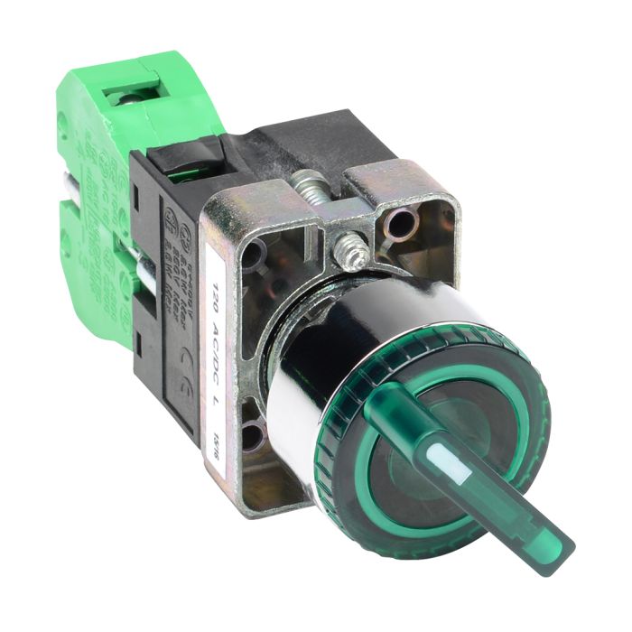 Selector switch, 22 mm, 2-position, maintained, LED illuminated, 1 N.O. contact(s), Operator: green, knob, 30 mm, round, plastic, 120 VAC/DC, full voltage.