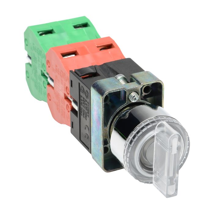 Selector switch, 22 mm, 3-position, spring return to center, LED illuminated, 2 N.C./2 N.O. contact(s), metal bezel, Operator: clear, knob, 30 mm, round, plastic, 24 VAC/DC, full voltage.