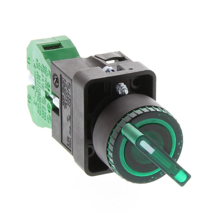 Selector switch, 22 mm, 2-position, spring return from right, LED illuminated, 1 N.O. contact(s), plastic bezel, Operator: green, knob, 30 mm, round, plastic, 24 VAC/DC, full voltage.