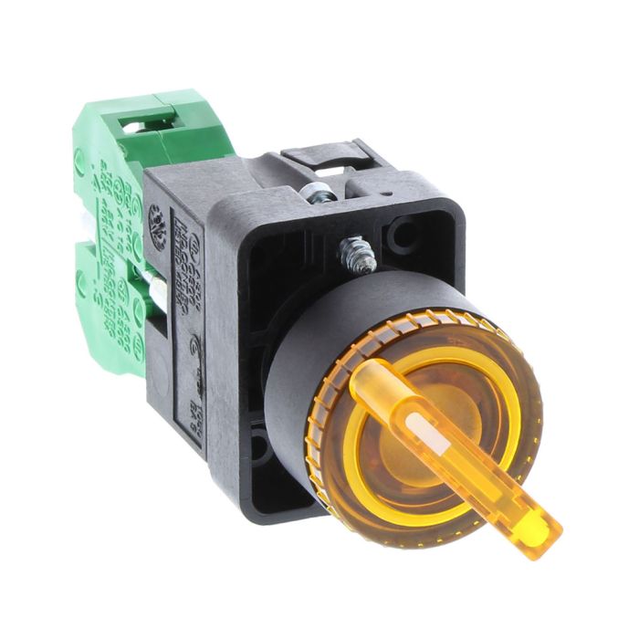 Selector switch, 22 mm, 2-position, spring return from right, LED illuminated, 1 N.O. contact(s), plastic bezel, Operator: yellow, knob, 30 mm, round, plastic, 120 VAC/DC, full voltage.