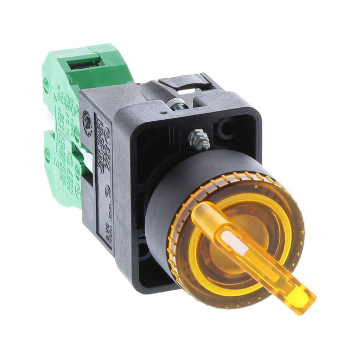 Selector switch, 22 mm, 2-position, spring return from right, LED illuminated, 1 N.O. contact(s), plastic bezel, Operator: yellow, knob, 30 mm, round, plastic, 24 VAC/DC, full voltage.