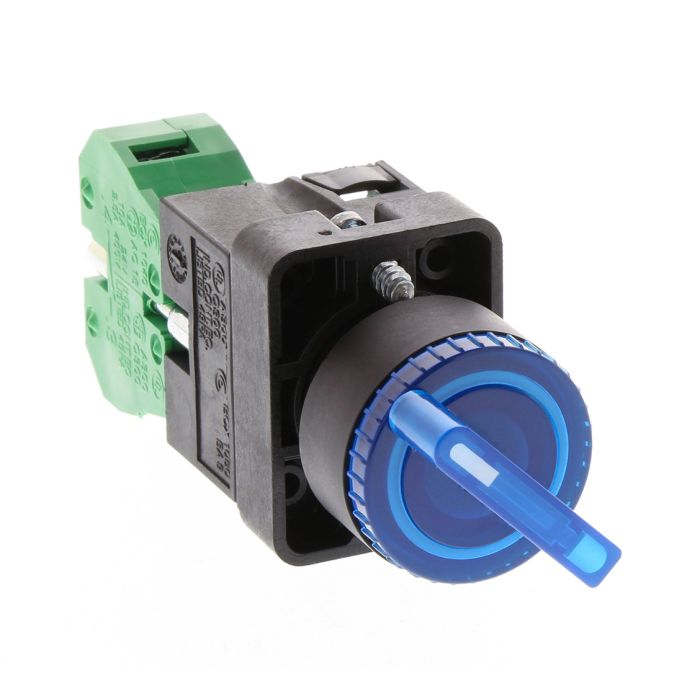 Selector switch, 22 mm, 2-position, spring return from right, incandescent illuminated, 1 N.O. contact(s), plastic bezel, Operator: blue, knob, 30 mm, round, plastic, 120 VAC/DC, full voltage.