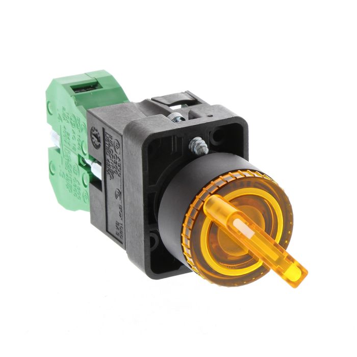 Selector switch, 22 mm, 2-position, maintained, incandescent illuminated, 1 N.O. contact(s), Operator: yellow, knob, 30 mm, round, plastic, 24 VAC/DC, full voltage.