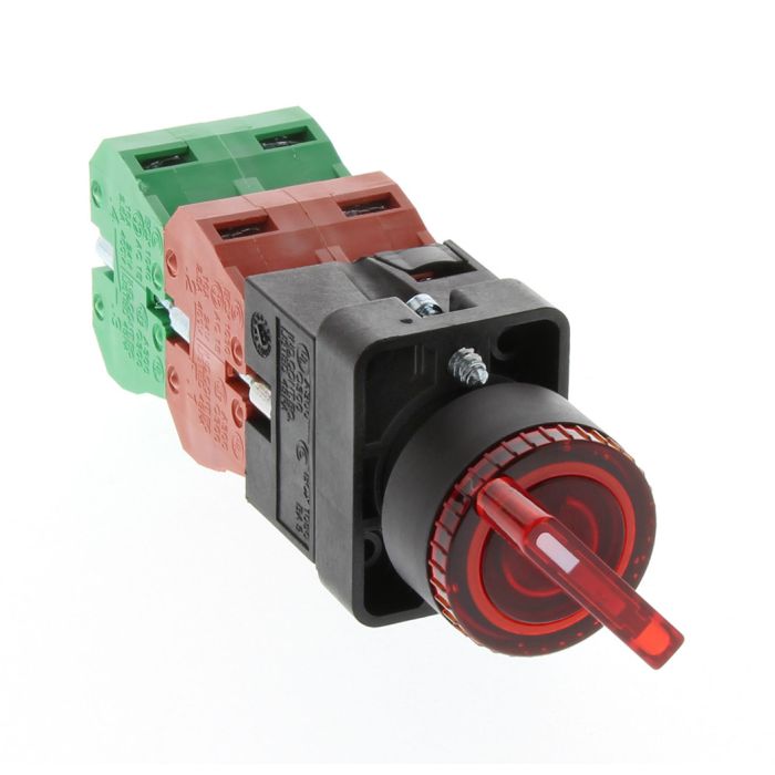Selector switch, 22 mm, 3-position, maintained, incandescent illuminated, 2 N.C./2 N.O. contact(s), plastic bezel, Operator: red, knob, 30 mm, round, plastic, 120 VAC/DC, full voltage.
