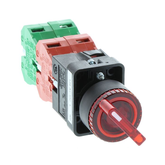 Selector switch, 22 mm, 3-position, maintained, LED illuminated, 2 N.C./2 N.O. contact(s), plastic bezel, Operator: red, knob, 30 mm, round, plastic, 120 VAC/DC, full voltage.