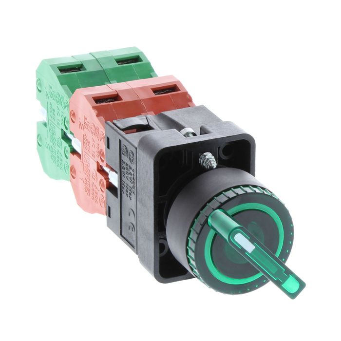 Selector switch, 22 mm, 3-position, maintained, LED illuminated, 2 N.C./2 N.O. contact(s), plastic bezel, Operator: green, knob, 30 mm, round, plastic, 120 VAC/DC, full voltage.