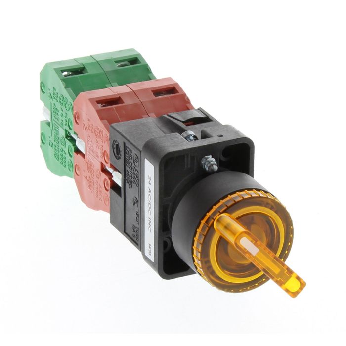 Selector switch, 22 mm, 3-position, maintained, incandescent illuminated, 2 N.C./2 N.O. contact(s), plastic bezel, Operator: yellow, knob, 30 mm, round, plastic, 24 VAC/DC, full voltage.