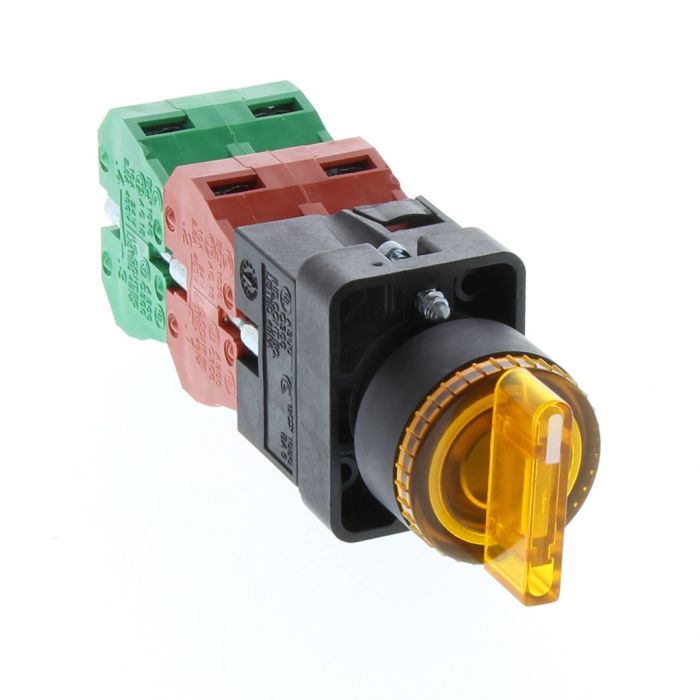 Selector switch, 22 mm, 3-position, spring return to center, incandescent illuminated, 2 N.C./2 N.O. contact(s), plastic bezel, Operator: yellow, knob, 30 mm, round, plastic, 120 VAC/DC, full voltage.
