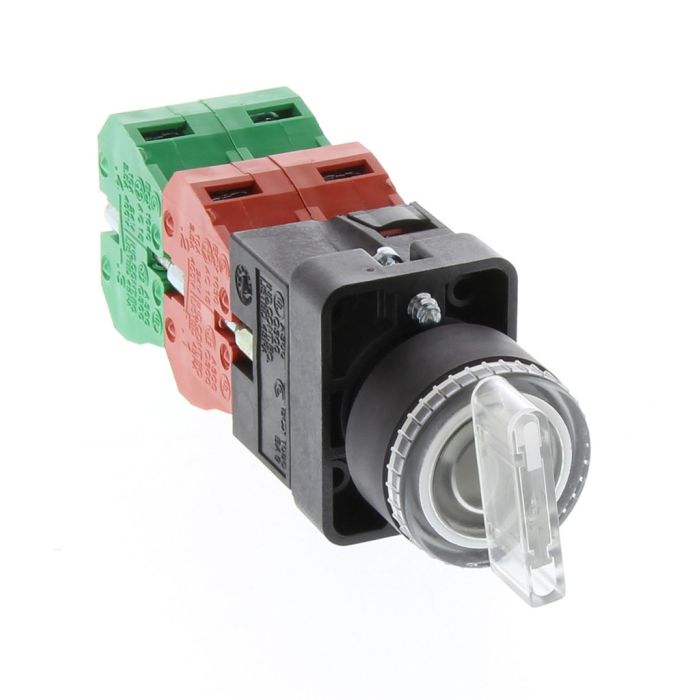 Selector switch, 22 mm, 3-position, spring return to center, incandescent illuminated, 2 N.C./2 N.O. contact(s), plastic bezel, Operator: clear, knob, 30 mm, round, plastic, 24 VAC/DC, full voltage.