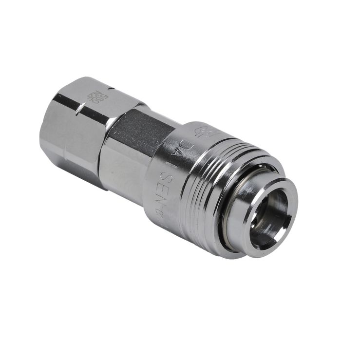 NITRA pneumatic quick disconnect fitting, automatic coupling, chrome-plated steel body, 1/4in universal to 1/4in female NPT.
