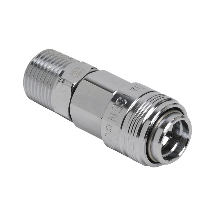 NITRA pneumatic quick disconnect fitting, automatic coupling, chrome-plated steel body, 1/4in industrial interchange plug to 3/8in male NPT.