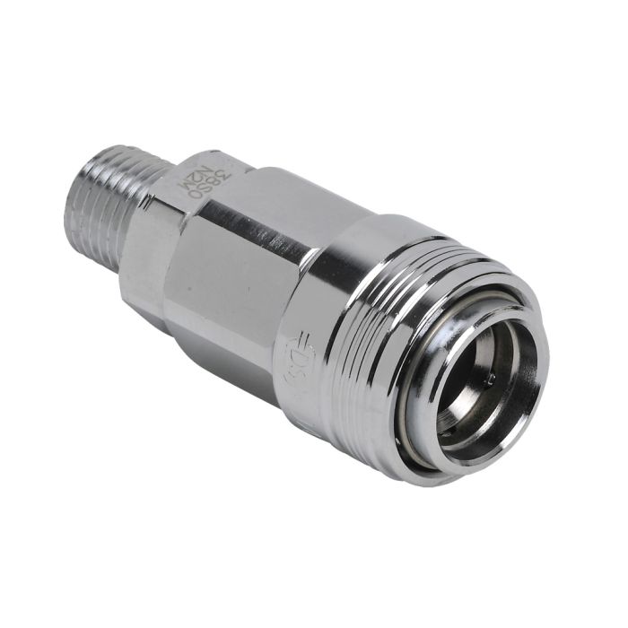 NITRA pneumatic quick disconnect fitting, automatic coupling, chrome-plated steel body, 3/8in industrial interchange plug to 1/4in male NPT.