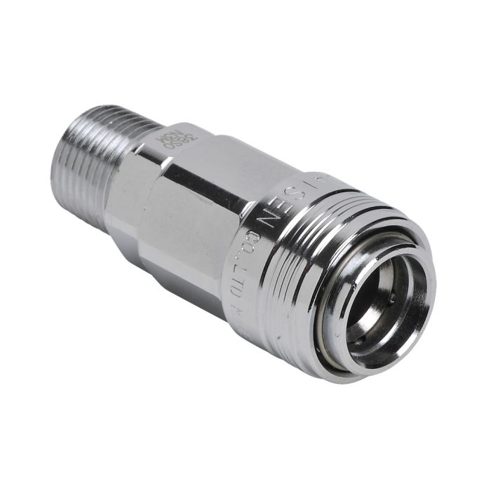 NITRA pneumatic quick disconnect fitting, automatic coupling, chrome-plated steel body, 3/8in industrial interchange plug to 3/8in male NPT.