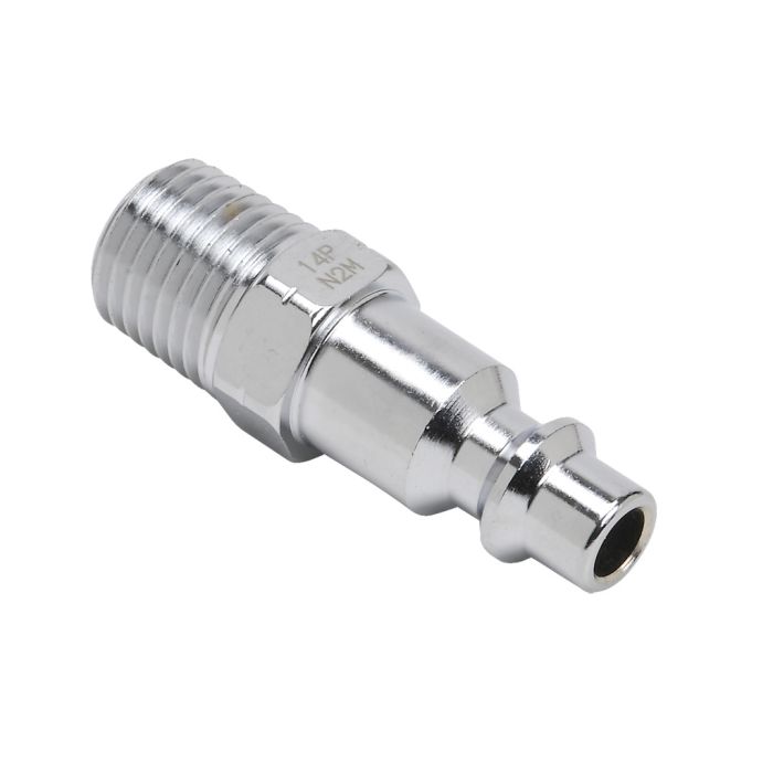 NITRA pneumatic quick disconnect fitting, coupling plug, chrome-plated steel body, 1/4in industrial interchange plug to 1/4in male NPT.
