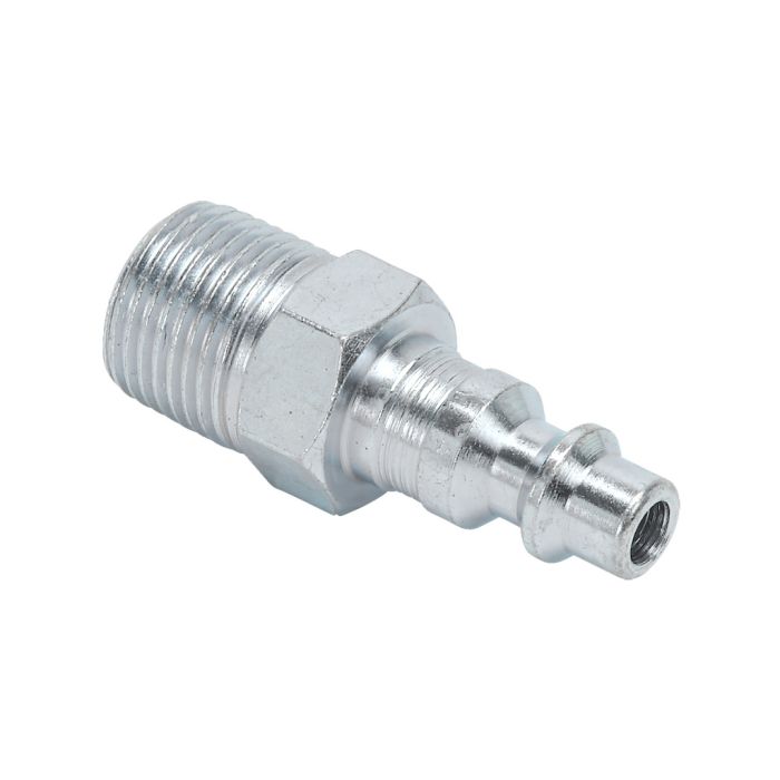 NITRA pneumatic quick disconnect fitting, coupling plug, steel body, 1/4in industrial interchange plug to 3/8in male NPT.