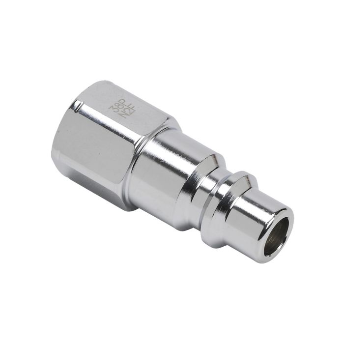 NITRA pneumatic quick disconnect fitting, coupling plug, chrome-plated steel body, 3/8in industrial interchange plug to 1/4in female NPT.