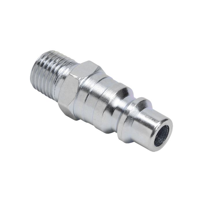 NITRA pneumatic quick disconnect fitting, coupling plug, steel body, 3/8in industrial interchange plug to 1/4in male NPT.