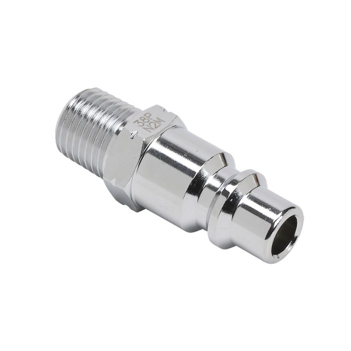 NITRA pneumatic quick disconnect fitting, coupling plug, chrome-plated steel body, 3/8in industrial interchange plug to 1/4in male NPT.