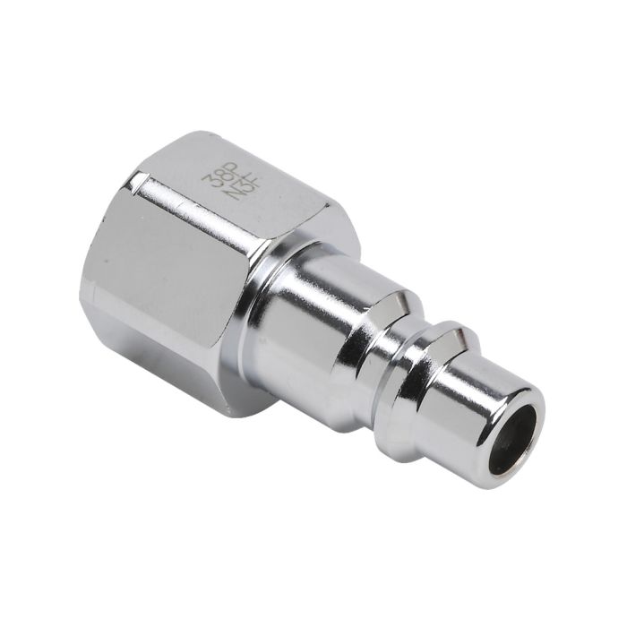NITRA pneumatic quick disconnect fitting, coupling plug, chrome-plated steel body, 3/8in industrial interchange plug to 3/8in female NPT.