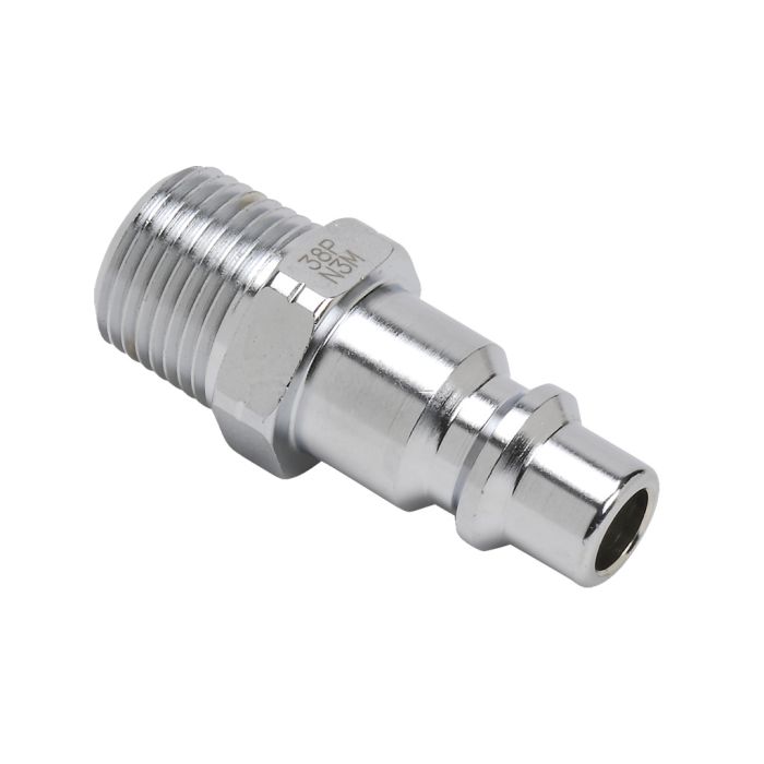 NITRA pneumatic quick disconnect fitting, coupling plug, chrome-plated steel body, 3/8in industrial interchange plug to 3/8in male NPT.